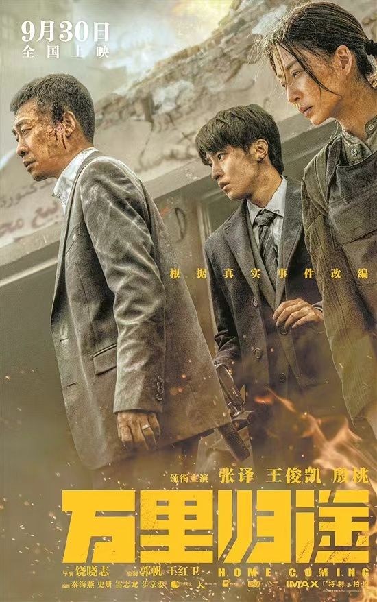 “我们带你们回家!”《万里归途》中,张译和王俊凯饰演的外交官深入枪林弹雨的异国小城,带领同胞徒步穿行沙漠戈壁,踏上危机四伏的撤侨之路。