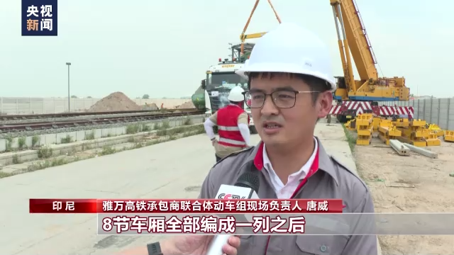 雅万高铁承包商联合体动车组现场负责人 唐威:我们会对车厢恢复编组,8节车厢全部编成一列车厢之后,再通过工程车拖到检修库里,在检修库里尽快进行动态调试,保证车辆具备最佳的状态。