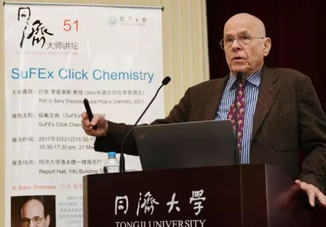2017年,夏普莱斯教授应邀访问同济大学,做客同济大学第51期大师讲坛,为相关学科近500位师生作了题为《硫氟交换(SuFEx)点击化学》的学术讲座,并欣然接受聘书,受聘为同济大学名誉教授。