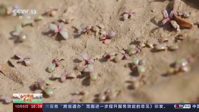 这片看似荒芜的土地上,正在孕育着希望。这些还不足1厘米高的幼苗就是刚刚满月的“胡杨宝宝”。别看现在“胡杨宝宝”个头小,它在地下的根系已经有几厘米长。