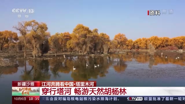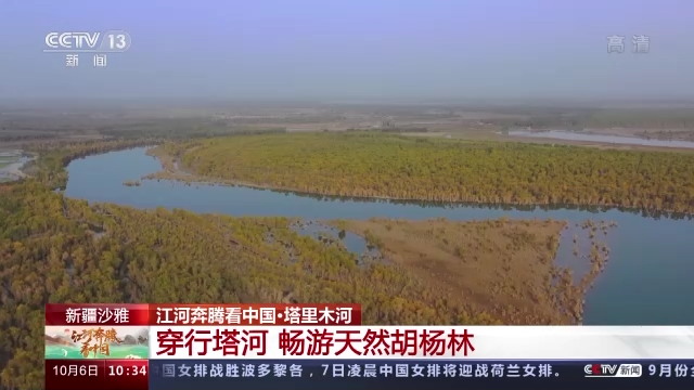 总台记者 蒋雪娇:这里是塔里木河下游若羌段,两岸郁郁葱葱的胡杨林绵延百余公里,深秋是胡杨林最美的季节,再过十天,连绵起伏的沙漠、蜿蜒流淌的塔里木河和金色的胡杨将在大地上勾勒出浓墨重彩的油画。
