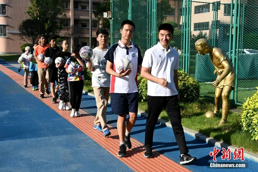 王亚锋正带着福州盲校里的学生到体育场训练,右边的雕塑是盲校以他为原型设立的