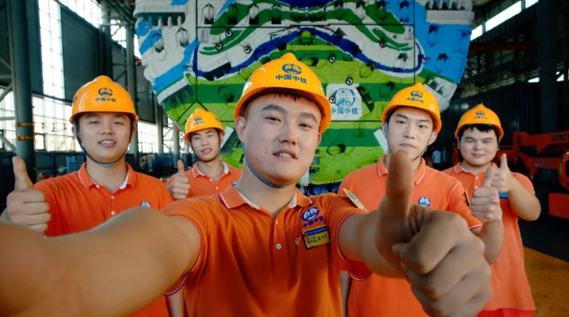 孟江华(中间)与00后产业工人在大国重器盾构机前合影