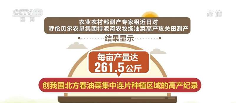 央视网消息:记者从内蒙古自治区农牧厅获悉,农业农村部测产专家组近日对呼伦贝尔农垦集团特泥河农牧场油菜高产攻关田测产的结果显示,每亩产量达261.5公斤,创我国北方春油菜集中连片种植区域的高产纪录。