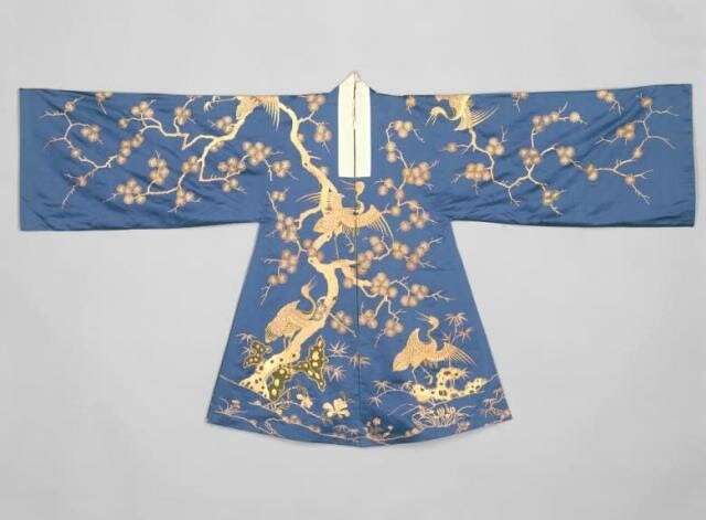 △以金线和孔雀羽毛绣成的戏服“蓝色缎平金绣整枝松鹤纹老旦帔”