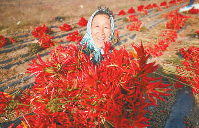 把广大农民对美好生活的向往化为推动乡村振兴的动力,切实落实强农惠农富农政策。图为2019年10月,辽宁省法库县秀水河子镇长岗子村村民喜获辣椒丰收。