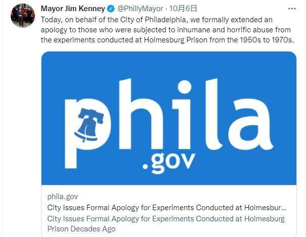 当地时间2022年10月6日,宾州费城市市长吉姆•肯尼在社交媒体上宣布,费城市政府发表声明,就霍姆斯伯格监狱的一系列“医学种族主义”实验,正式道歉。
