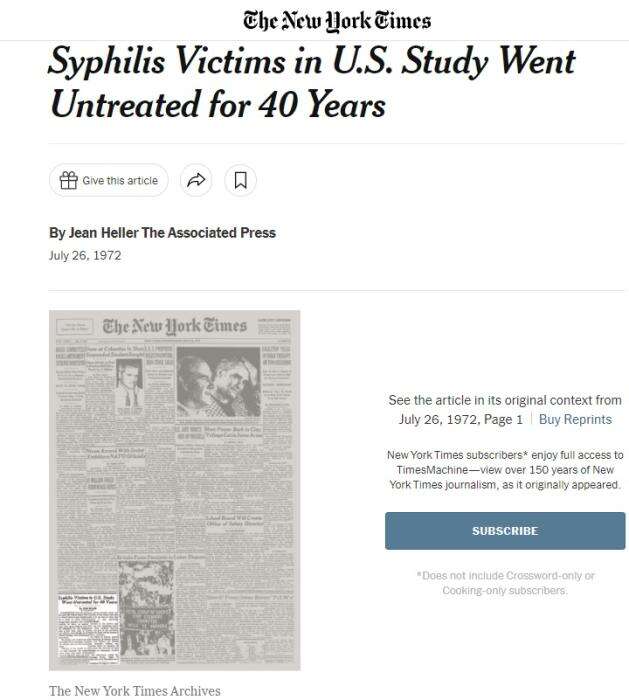 1972年美国《纽约时报》对塔斯基吉梅毒实验揭露性报道的版面。图片来源:《纽约时报》网站截图