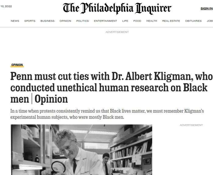 评论:宾州需与对非裔实施不道德人体实验的克利格曼博士“割席”。图片来源:《费城问询报》报道截图