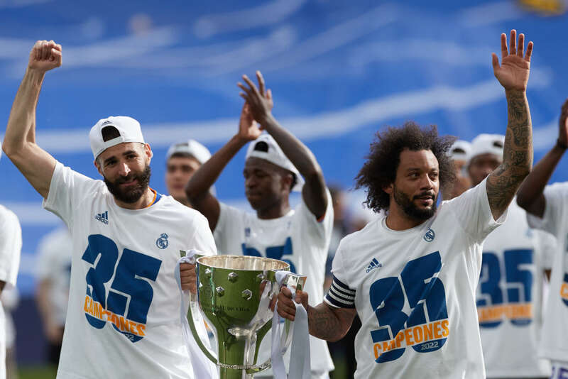 4月30日,本泽马(左)和马塞洛庆祝夺得2021-2022赛季西班牙足球甲级联赛冠军。新华社记者孟鼎博摄