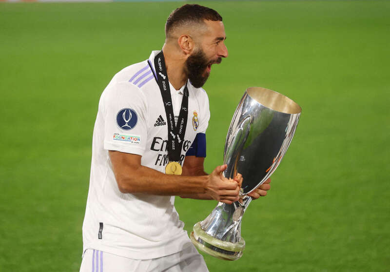 8月10日,本泽马庆祝夺得2022年欧洲超级杯足球赛冠军。新华社/路透