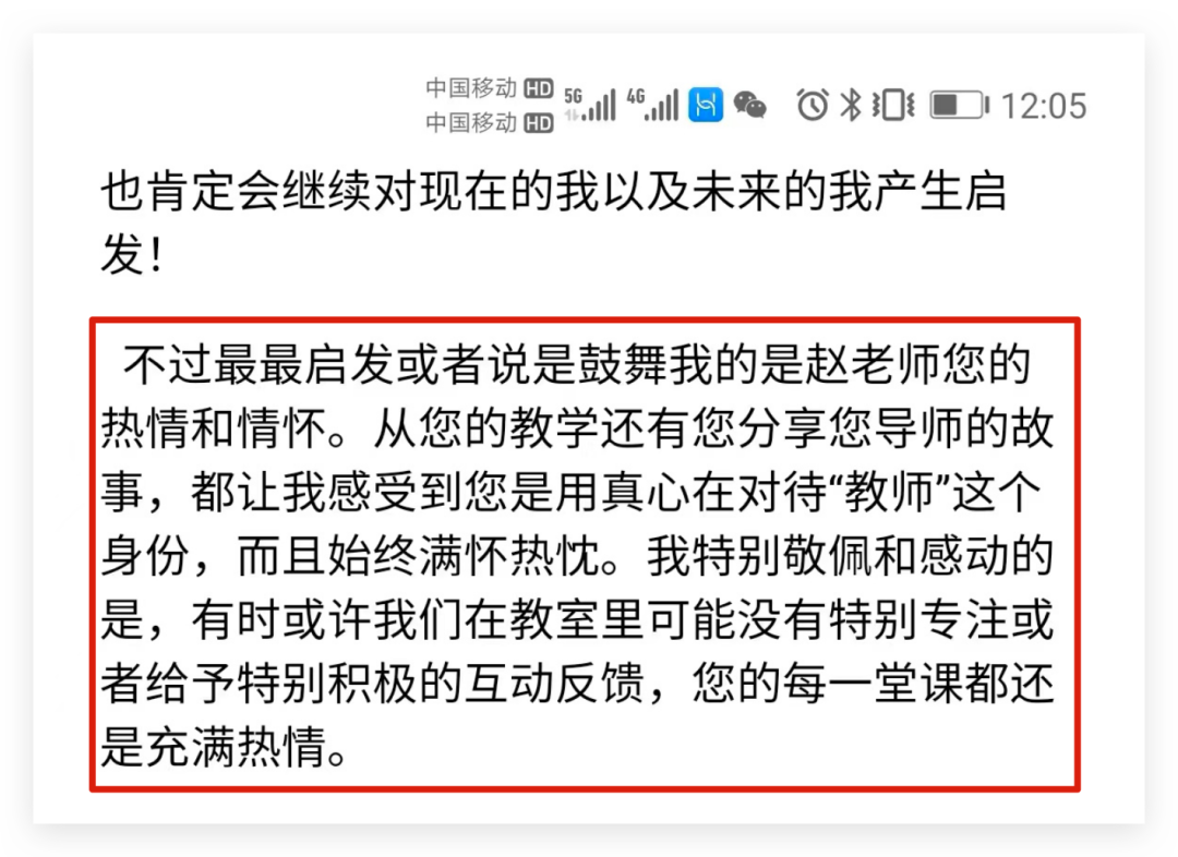 在2021年的春节即将到来之际,赵坤收到一条同学的留言:“最最启发或者说是鼓舞我的是赵老师您的热情和情怀。从您的教学还有您分享您导师的故事,都让我感受到您是用真心在对待教师这个身份,而且始终满怀热忱。尽管我现在还处于生涯规划的阶段,还不确定未来会往哪个方向发展,但是成为一名教师(尤其是成为像我遇到过的老师一样的好老师)是我非常非常理想的规划之一。”