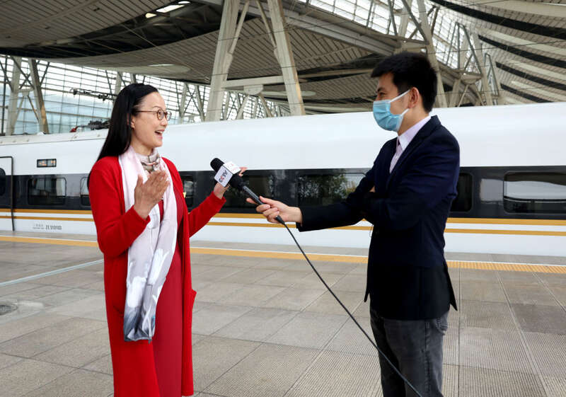 10月14日,来自江苏省的党的二十大代表乘高铁抵达北京南站。这是郁霞秋代表(左)在接受记者采访。新华社记者 陈建力 摄
