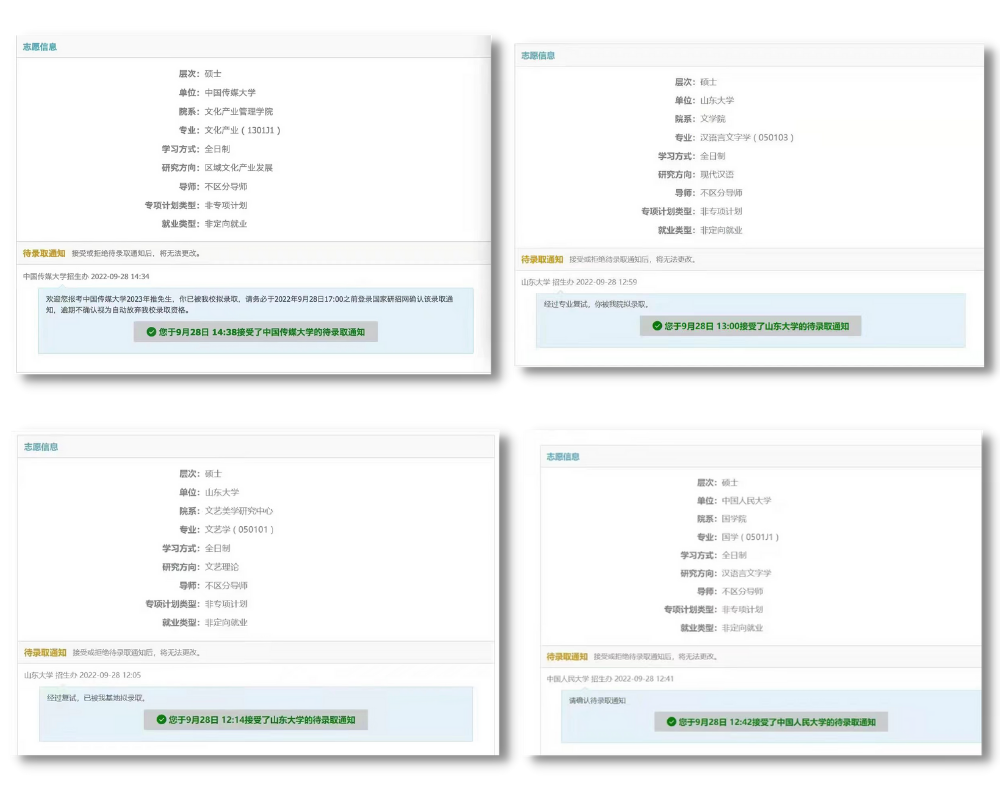 9月28日14时38分,赵文浩点击了中国传媒大学的拟录取确认,心中的紧张与不安顿时消散,她第一时间和朋友们分享了这个令人激动的好消息。在此之前,肖清三已经接到了中国人民大学的拟录取通知,钟佳彤与崔蕊也将结伴进入山东大学攻读研究生。辩论队的四人全部保研至“双一流”高校,为这场保研之旅画上了圆满句号。