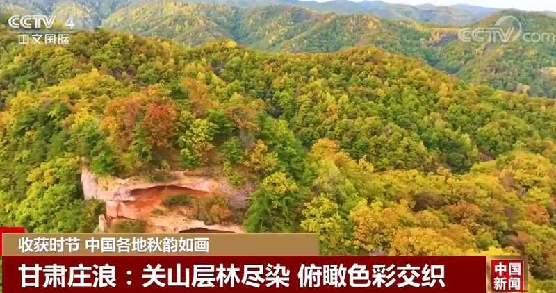 位于甘肃平凉庄浪县的关山,是重要的天然林区和草场,辖区内植被丰富。从空中俯瞰,大片的林海由金黄、橙红、橘红等色彩交织在一起,五彩缤纷。在阳光的照耀下,远山、林海、湖泊交相辉映,构成了一幅独特的秋日美景。