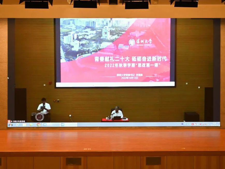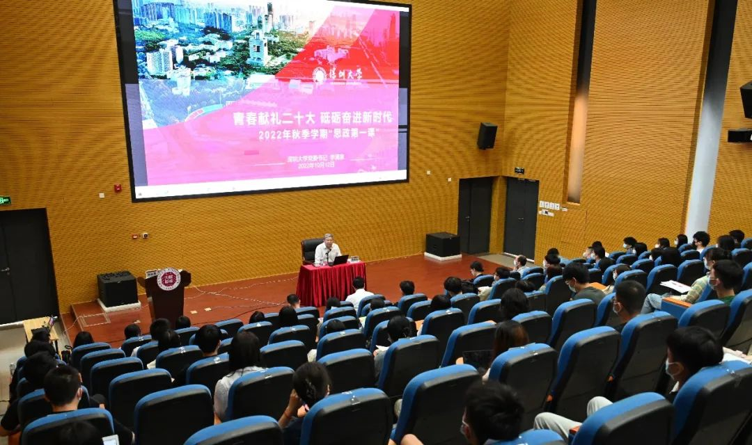 “⻘春献礼⼆⼗⼤,砥砺奋进新时代”——为了帮助⼴⼤新同学更好地了解深⼤的过去、现在和未来,更好地理解、读懂⼤学⽣活,10⽉12⽇下午,深圳⼤学党委书记李清泉在丽湖校区守忠楼⼀号报告厅开讲新学期思政课,丽湖校区部分2022级新⽣现场聆听了此次讲座,粤海校区师⽣在汇星楼⼀号报告厅进⾏线上同步学习。副校⻓李永华主持活动。