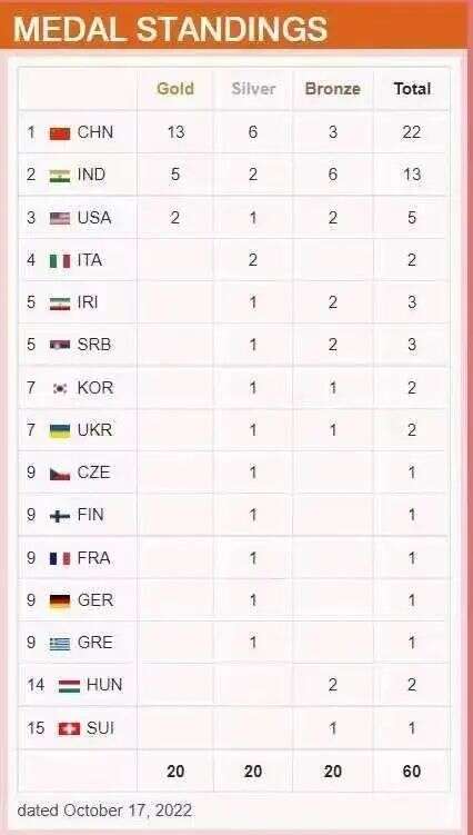 北京时间10月17日,2022年射击(步手枪)世锦赛在埃及开罗结束第四日争夺。目前,中国队以13金6银3铜共22枚奖牌数在金牌和奖牌双榜上遥遥领先。