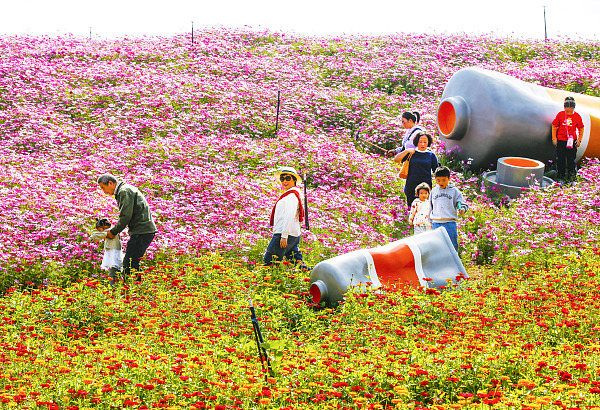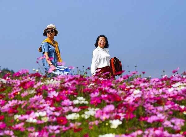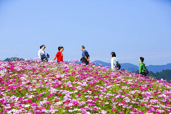 2022年10月16日,杭州,淳安县左口乡千岛湖理想花园内,百日菊、格桑花进入最佳观赏期,吸引众多市民和游客前来打卡拍照。
