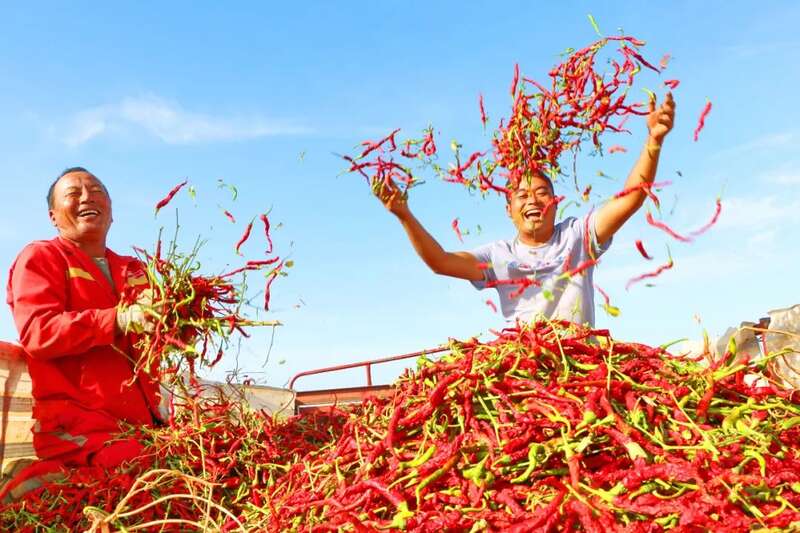 新疆库车市墩阔坦镇繁荣村,辣椒喜获丰收。吴乐摄(中经视觉)