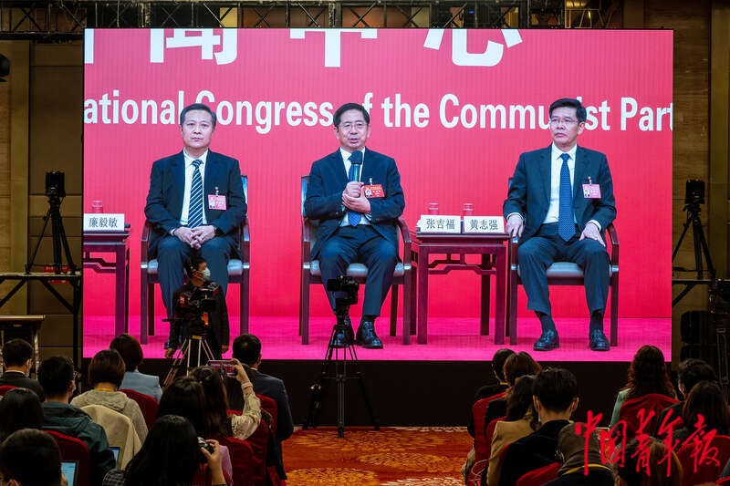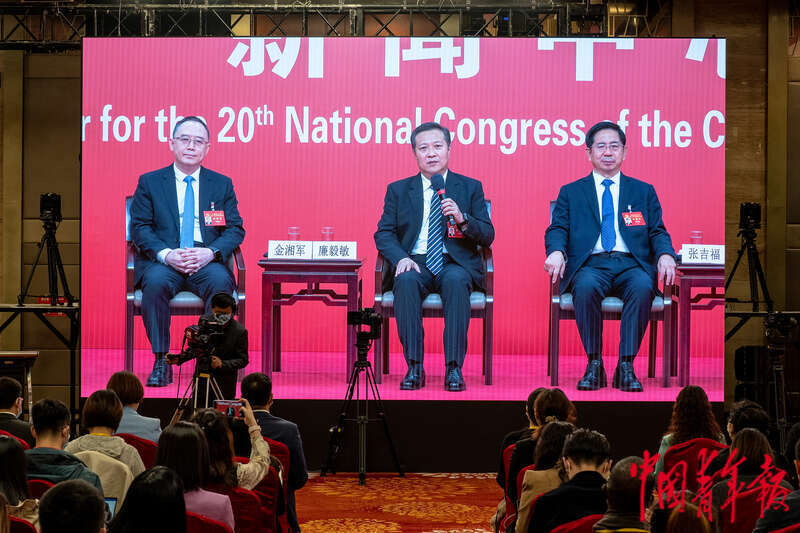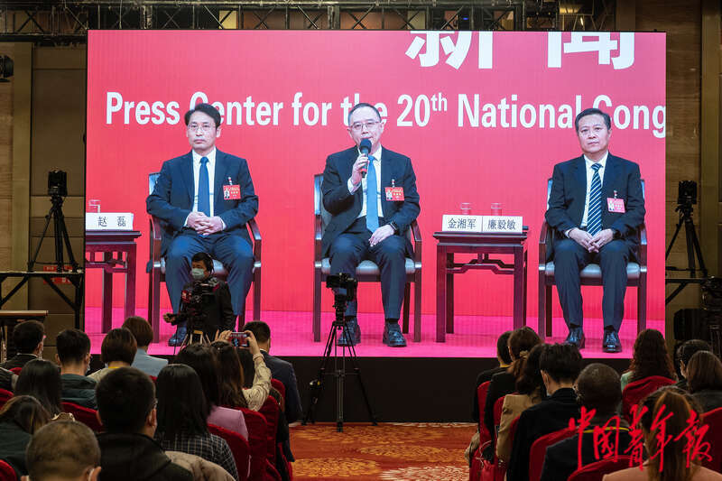 10月18日,二十大新闻中心举办第一场集体采访,天津市委副书记金湘军(中)回答记者提问。 中青报·中青网记者 李隽辉/摄