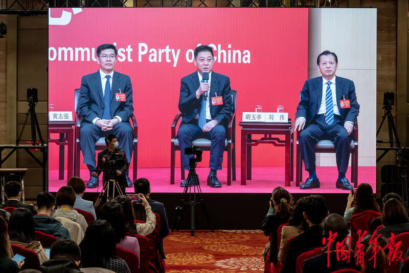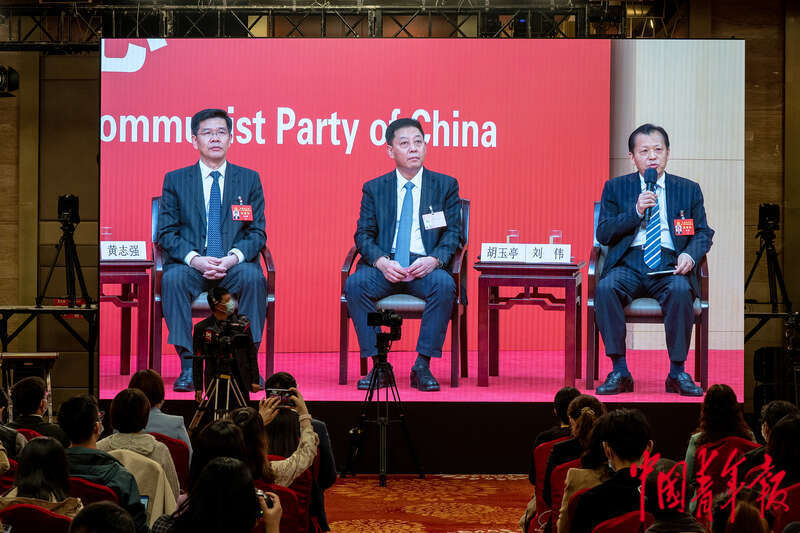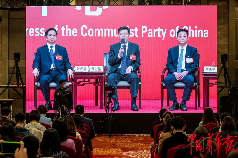 10月18日,二十大新闻中心举办第一场集体采访,内蒙古自治区党委常委、自治区常务副主席黄志强(中)回答记者提问。 中青报·中青网记者 李隽辉/摄