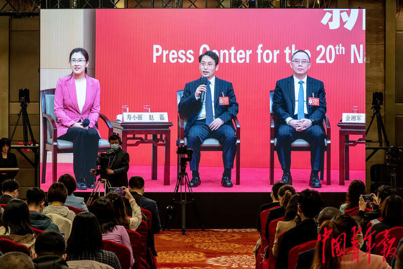 10月18日,二十大新闻中心举办第一场集体采访,北京市委常委、秘书长赵磊(中)回答记者提问。中青报·中青网记者 李隽辉 /摄