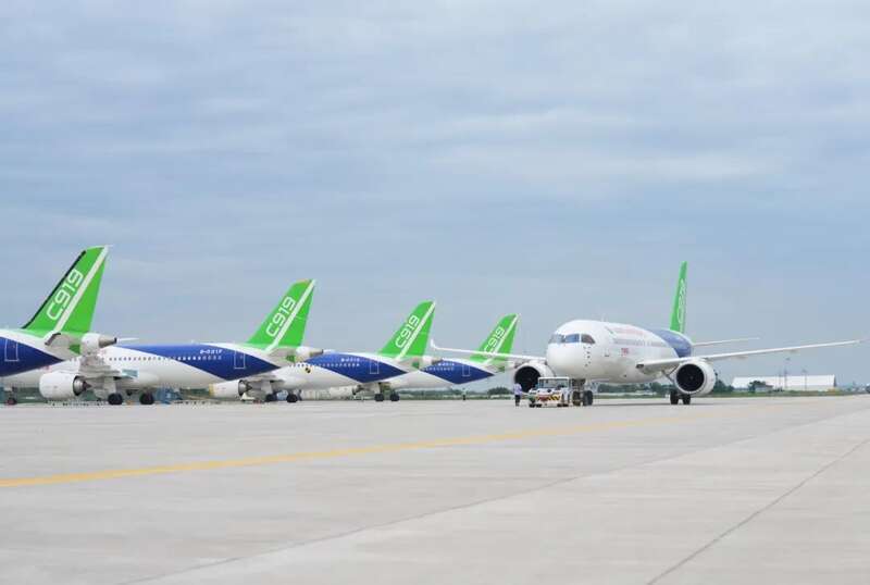 2022年7月18日在陕西省蒲城县拍摄的C919大型客机的试飞机。图源:新华社