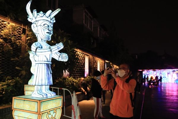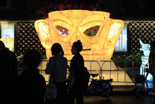 2022年10月19日,正在成都市宽窄巷子展出的古蜀文明彩灯光影艺术展吸引游客。本次展览展出了6组以太阳神鸟金饰、黄金面具、青铜立人等古蜀金沙文化元素为灵感创作的彩灯光影艺术作品。 中新社记者 王磊 摄
