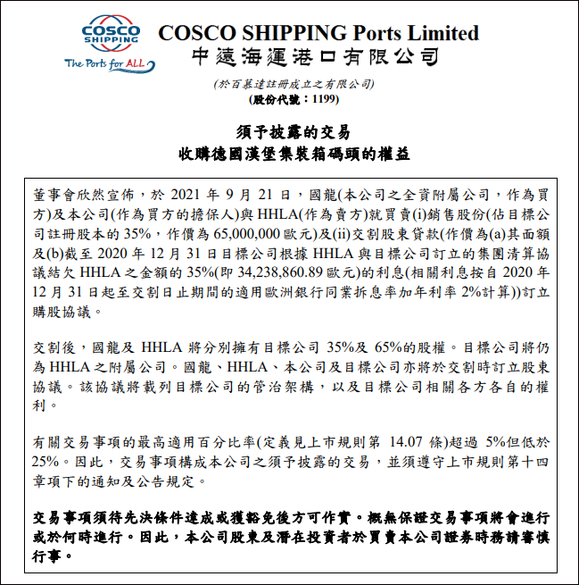 2021年9月,德国汉堡港务集团“汉堡港口与物流公司(HHLA)”宣布,中远海运港口将获得汉堡港Tollerort集装箱码头35%的权益,作价为6500万欧元。中远海运表示,预期交易事项将为公司创造新的增长点,并继续为全球各航运公司提供优质的供应链服务。