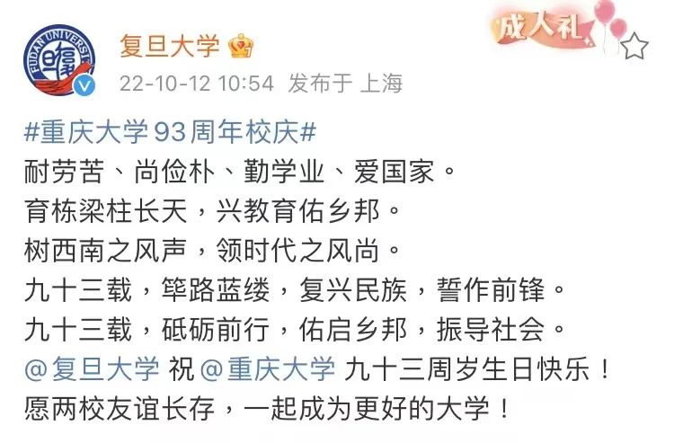 祝重庆大学93岁生日快乐!重庆大学,是培育新时代青年的沃土。今天一大批怀着炽热梦想的重大学子,牢记“耐劳苦、尚俭朴、勤学业、爱国家”的校训精神,勇敢前行,向上生长,用青春智慧去创造更美好的中国!