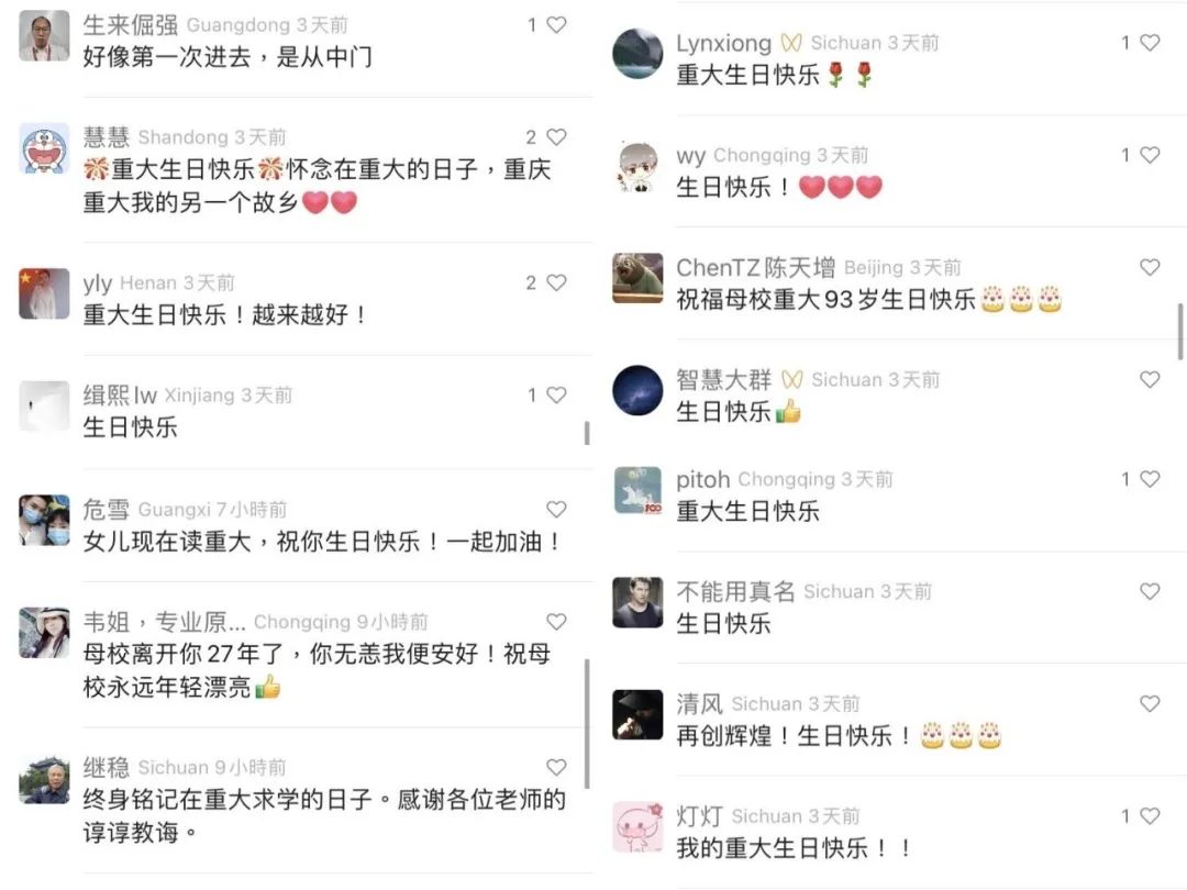 重大生日快乐!今年是我毕业的第一年,离开你也才四个月,但足以让我怀念起你的美食美景,粤式烧腊、姜鸭面、宜宾燃面……还有虎溪的银杏大道,漂亮又时尚的图书馆,学校门口的美食都是难忘的记忆啊!等到一百周年的时候,一定会有很多重大人聚首重庆,在重大的“怀抱”里感怀大学时光,然后一起庆祝重大的盛事!等我们回去!