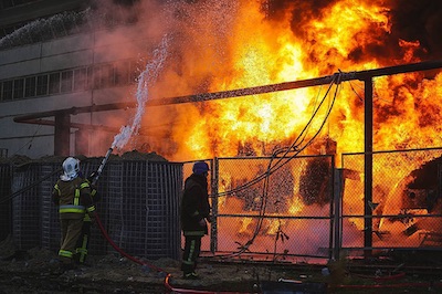 当地时间2022年10月18日,乌克兰基辅,俄罗斯针对能源基础设施的攻击后,消防人员正在对一场火灾进行应急处置。视觉中国 图