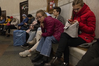 当地时间2022年10月20日,乌克兰基辅,当地响起空袭警报,市民群众躲在地铁站内。视觉中国 图