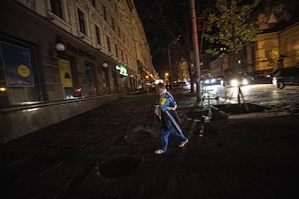 当地时间2022年10月15日,乌克兰基辅,当地一个电力设施被毁后,居民被敦促在晚上减少用电,城市街道陷入半黑暗状态。视觉中国 图