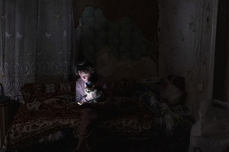 当地时间2022年10月20日,乌克兰博罗江卡,坐在一片黑暗中的市民抱着她的猫在看手机。视觉中国 图