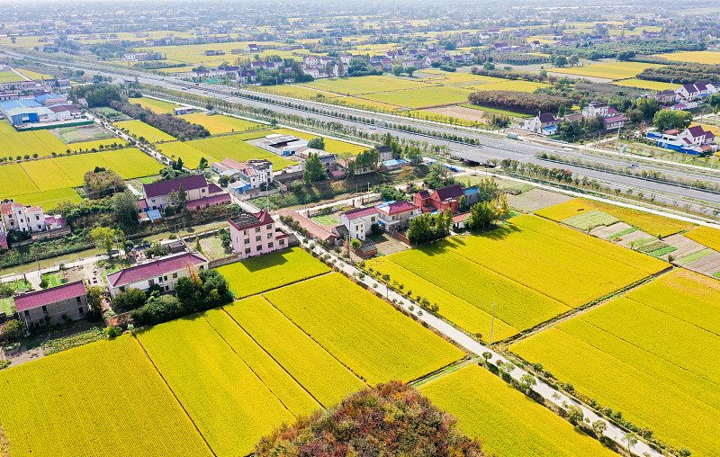 2022年10月21日,江苏南通,如皋市城南街道桃林社区,田园色彩斑斓,金色稻田与民居、河流、道路、绿色产业交相辉映,构成一幅美丽金秋画卷。