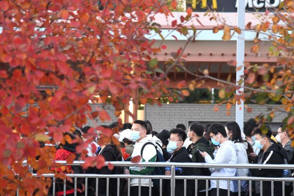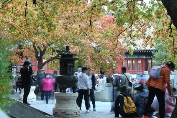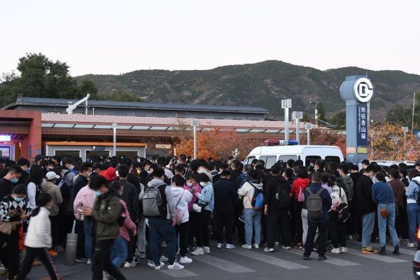 2022年10月22日,北京,香山红叶进入变色盛期,游客量大增,同时京郊线乘客猛增。