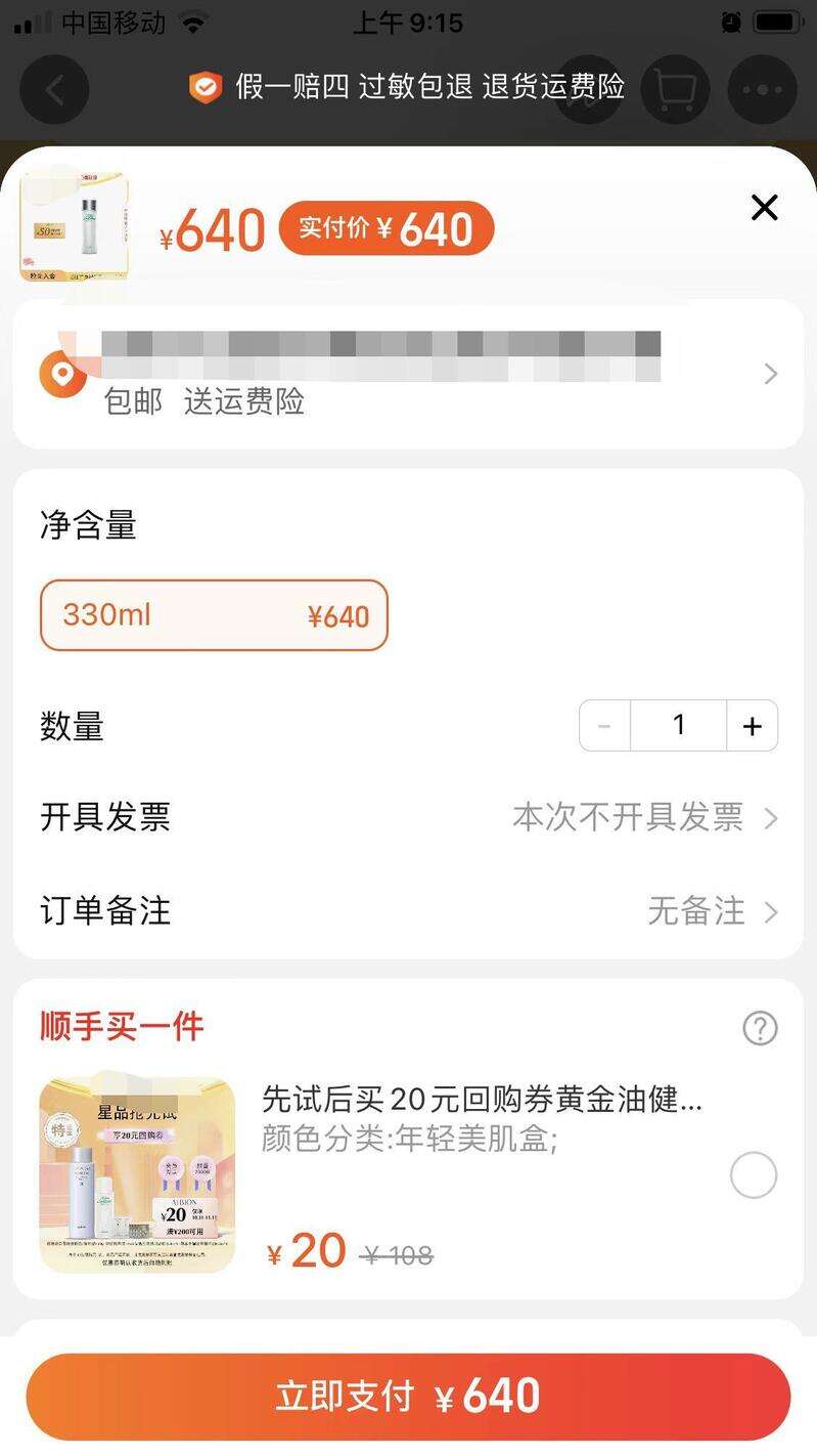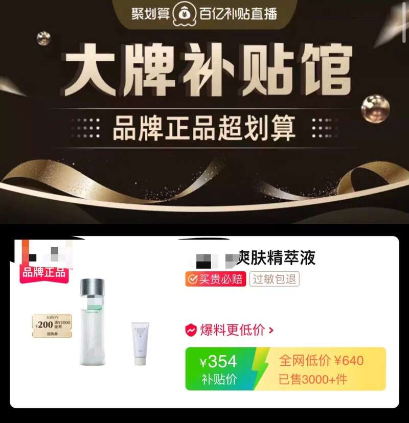 10月24日,记者在淘宝“聚划算百亿补贴”里看到,某护肤品官方旗舰店正在推广一款“爽肤精萃液”,产品页面上印有“官旗五折”字样,补贴券后价为319元。