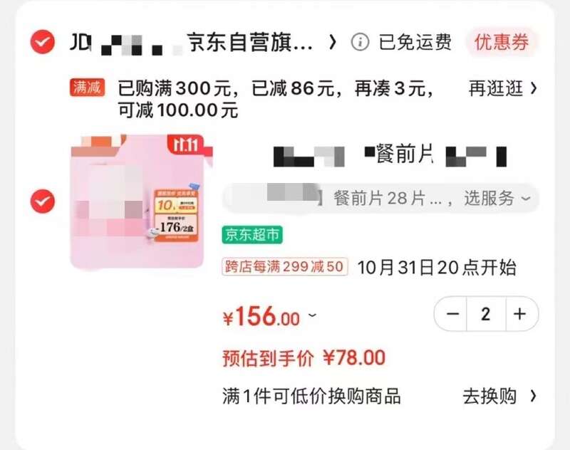 10月24日,记者在某健康食品京东自营旗舰店内购买了几款代餐食品,包括两盒“餐前片”。算上各种折扣后,实际支付44元/盒。