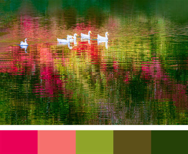 ↑辽宁省丹东市天桥沟国家森林公园,湖面倒映着五彩斑斓的秋色,几只白鹅在水面上游曳。CICPHOTO/赵树生 摄