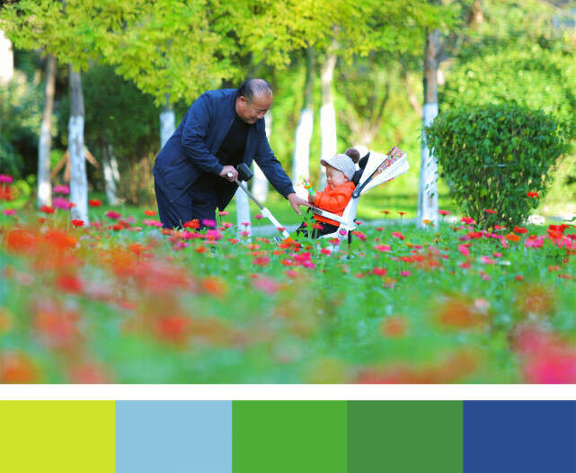 ↑山东省青岛市李沧区浮山路街道,一名老人带着孩子在花丛边散步。CICPHOTO/张鹰 摄