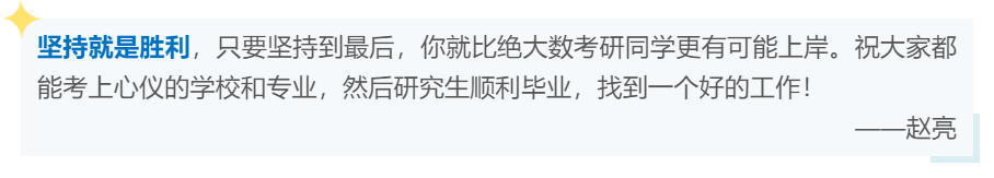 赵亮:坚持不懈,劳逸结合。考研是非常漫长的过程,从开始准备一直到收到研究生拟录取通知,必须坚持下去,很多人就是中途放弃最终没有上岸。