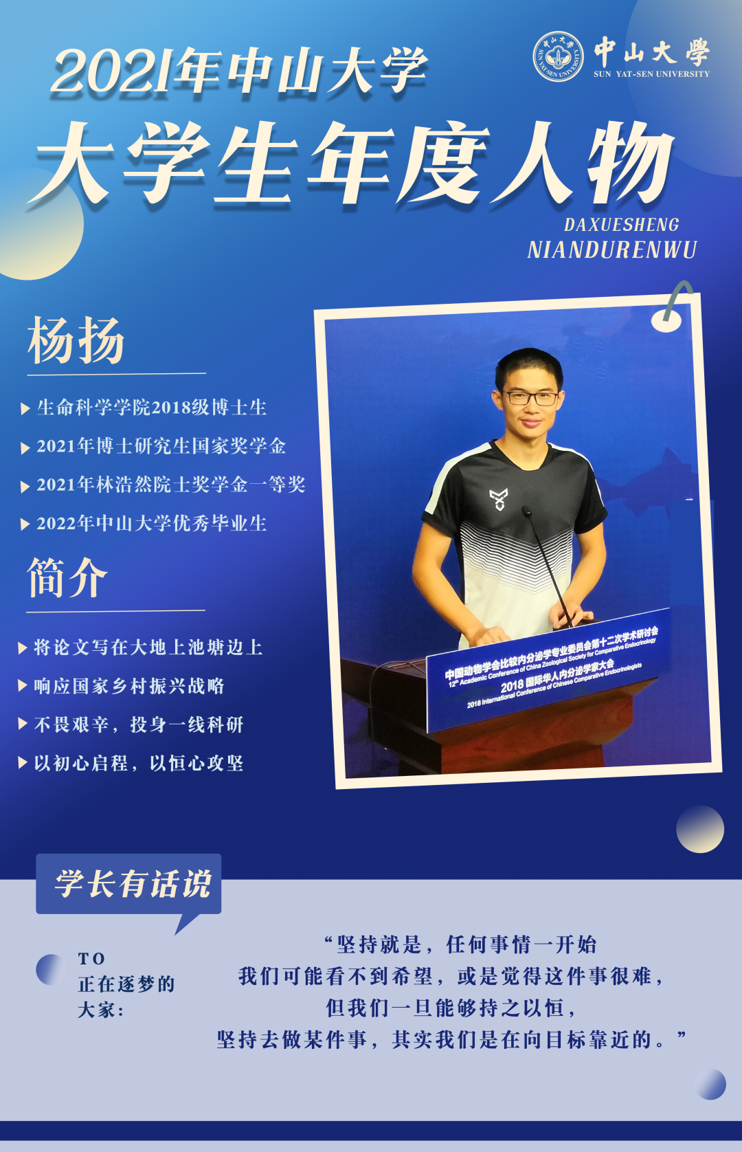 近期,中山大学2022年大学生年度人物评选结果揭晓,7名同学、3个团队获评中山大学2021年大学生年度人物。他们是我校“学在中大、追求卓越”的优秀代表,展现了中大学子自强不息、奋发向上的精神风貌。青年学生该以怎样的实际行动,学习谱写新时代的青春之歌?我们推出 “中大学生年度人物”专题报道,通过讲述年度人物的先进事迹,发挥优秀学子的榜样力量,营造积极向上的良好氛围。