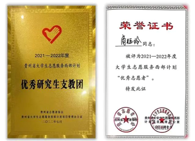 在贵州省大学生志愿服务西部计划2021—2022年度表彰中,研支团贵州分队获评“优秀研究生支教团”,队长商钰玲获评“优秀志愿者”。