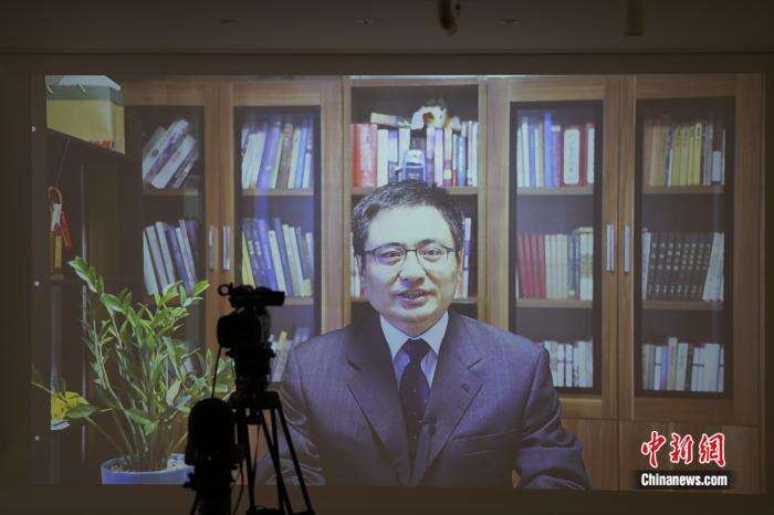 图为中国驻韩国大使馆公使方坤通过视频致辞。刘旭 摄