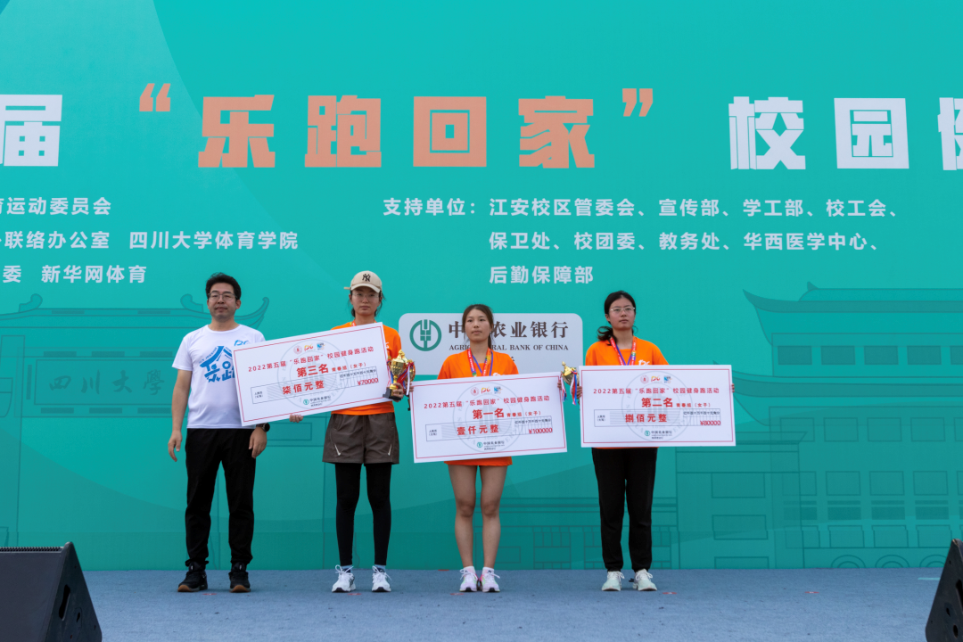 在本次举办的第五届“乐跑回家”校园健身跑活动中,教工组男子、女子第一名分别由包世丰、张巾娜获得,青春组男子、女子第一名分别由张佳宇、江瑞连获得,学生组男子、女子第一名由唐印、王佳奕获得。与会领导为获奖选手颁奖。