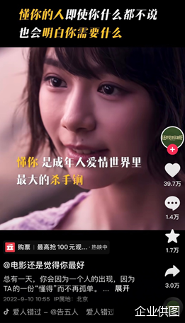 在官抖阵地,淘秀深度拆解电影里的情感元素,从正片预告、花絮、素人采访等全方位输出情感议题。难以忘记的前任、无法拒绝的现任,这些普世的情感体验议题牢牢吸引了观众的眼球。