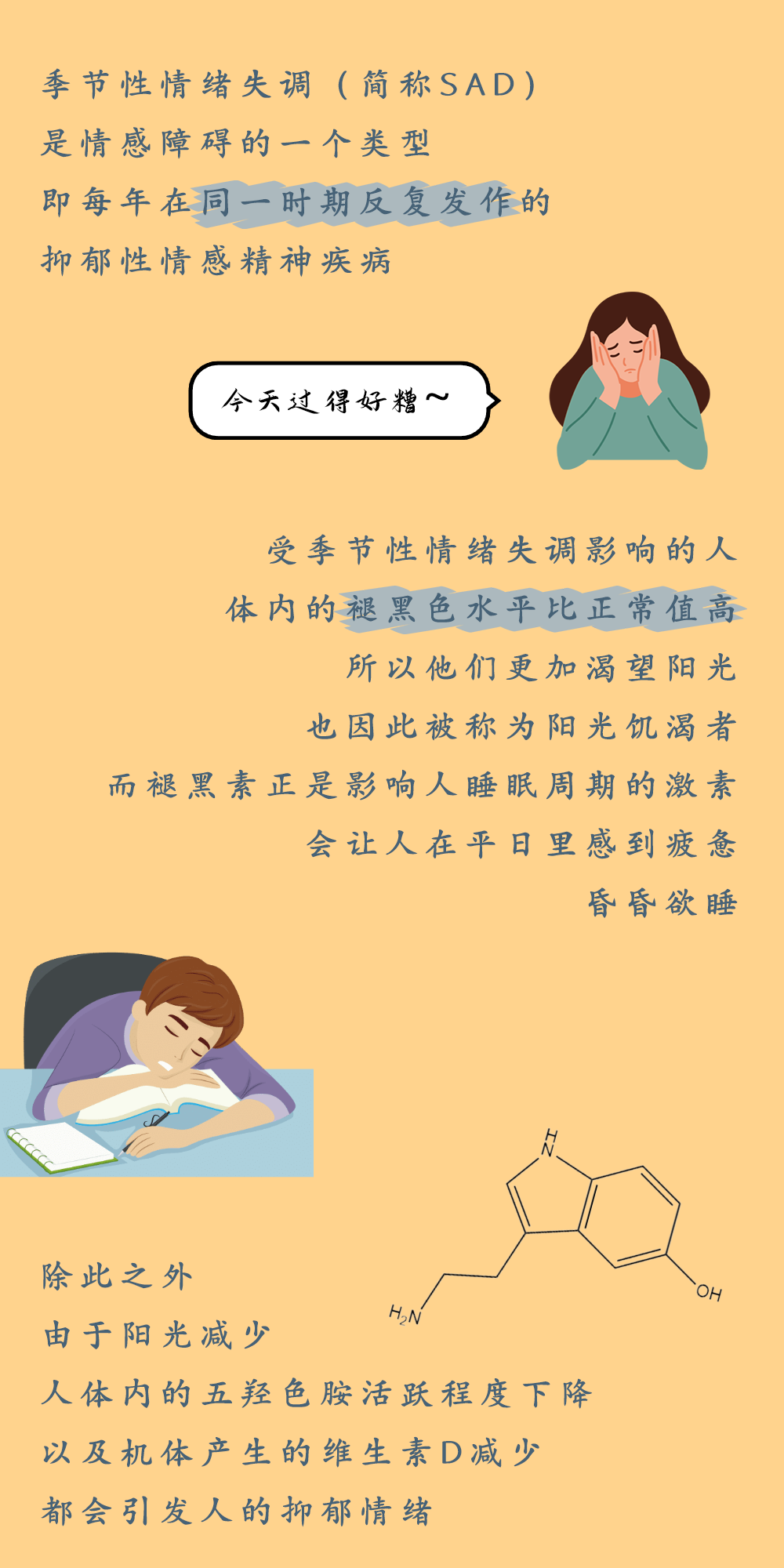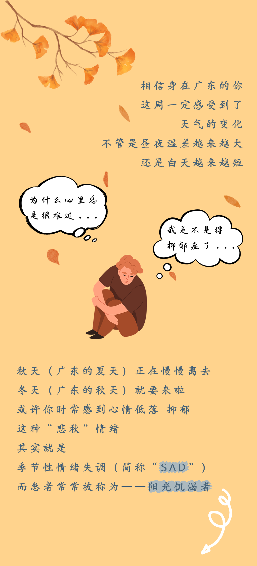 相信身在广东的你,最近一定感受到了天气的变化。随着昼夜温差越来越大,白天越来越短,你或许会时常感受到食欲不振、心情低落、抑郁。这其实是季节性情绪失调(简称SAD),这种病的患者通常被称为“阳光饥渴者”。由于体内褪黑色分泌比常人高,他们就更渴望阳光,那么温暖的阳光能给他们带来什么呢?下面就让萌主带着你一起,去认识季节性情绪失调的产生迹象和原因、症状以及缓解方法吧!希望这篇文章能帮助你,忘记悲伤秋天,走出坏情绪;爱上秋日暖阳,拥抱好心情!