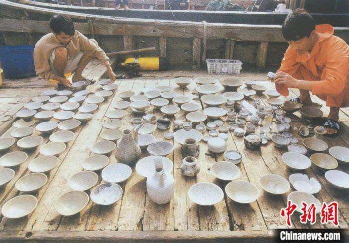 考古队员整理“华光礁I号”沉船遗址出水的瓷器。海南省博物馆供图
