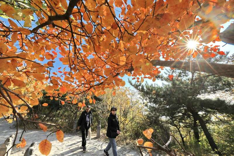10月24日,游客在山东省临沂市沂南县龙宿山上赏叶游玩。新华社发(尹君 摄)